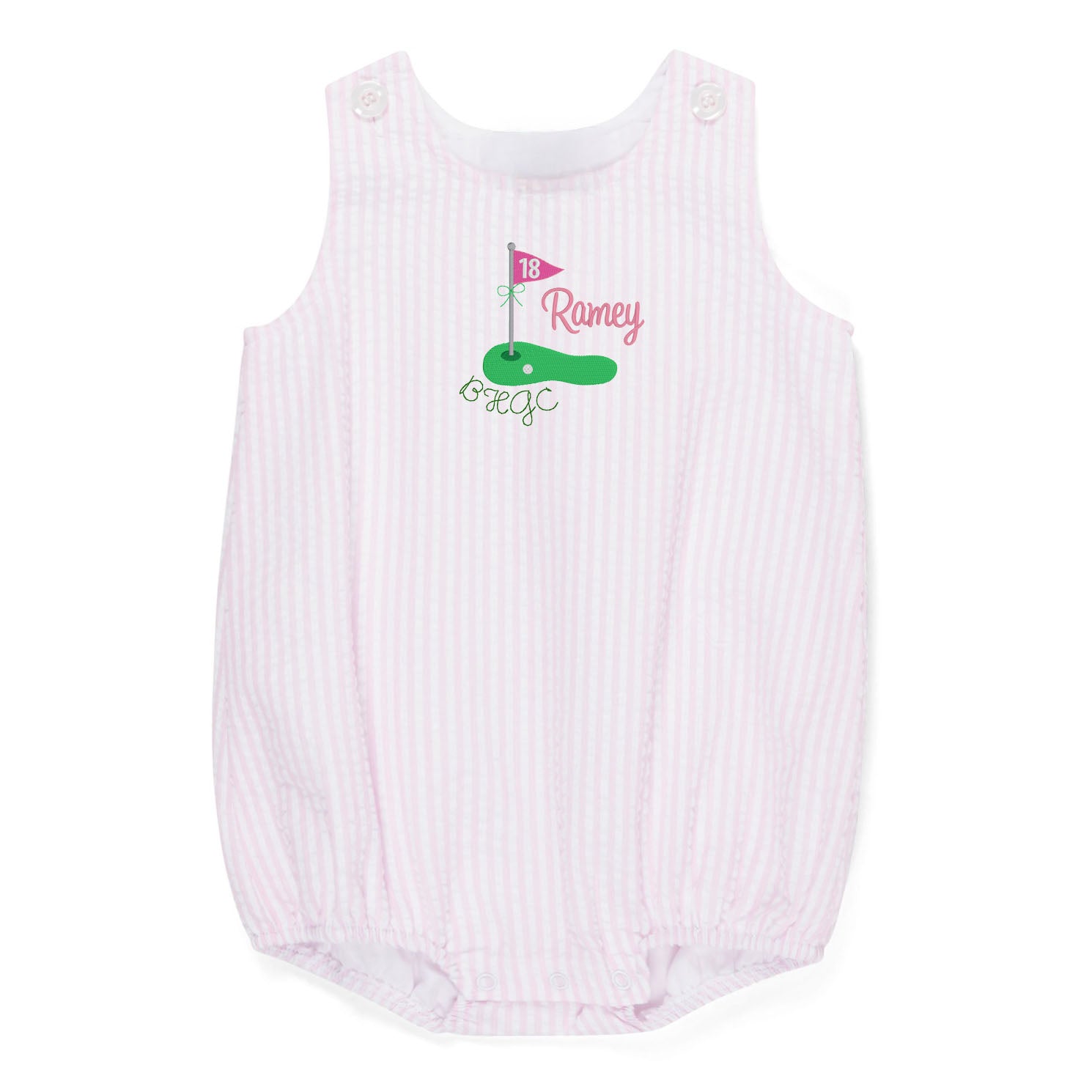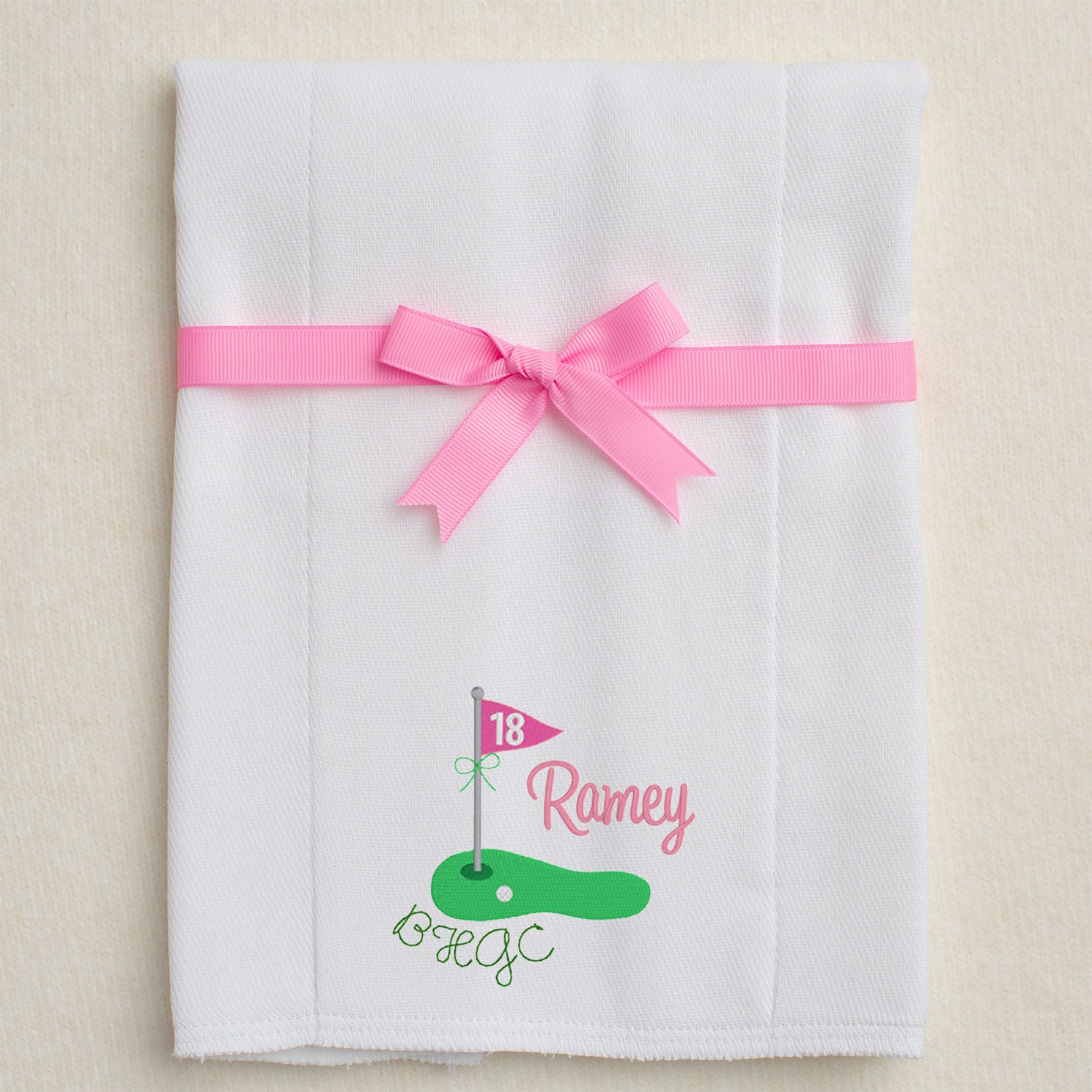Introduce your baby girl to a lifetime of birdies with this sophisticated embroidered 18th green design. A witty nod to golf heritage meets nursery charm—ideal for the BHGC parent who appreciates both the sport and the sentiment. This heirloom-quality piece transforms a passion for golf into a treasured memory for your little one. Each item is delivered to you packaged and ready for gifting!