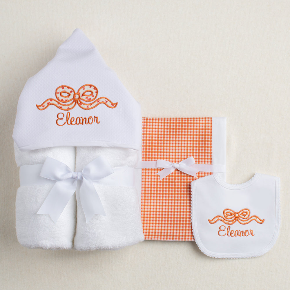Celebrate Texas pride with Deacon Lane's Charming Bundle, a thoughtfully curated three-piece set designed for the little Longhorn in your life. Featuring a custom bow in a burnt orange floral —the iconic University of Texas hue—personalized with an embroidered name, this bundle includes a soft hooded towel, appliqué bib, and fabric burp pad. Each piece honors Texas heritage with warmth and charm, crafted right here in Texas for families who cherish their Texas roots.