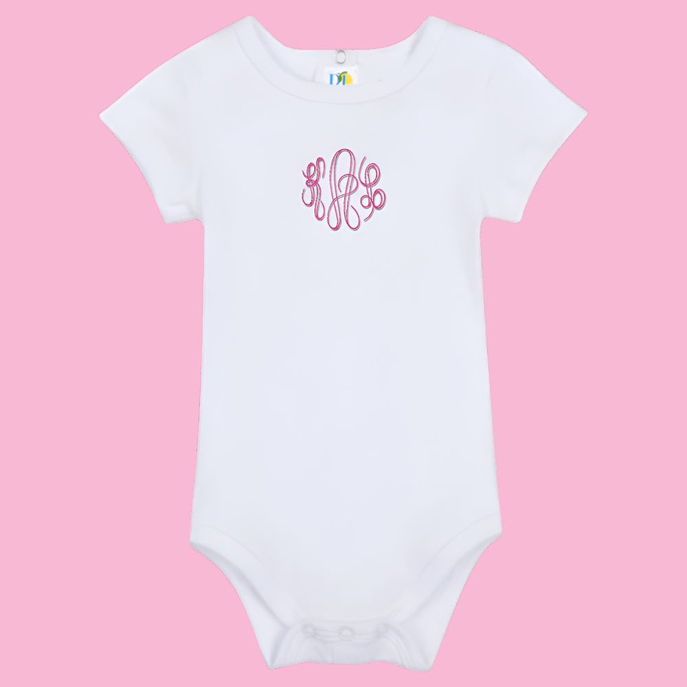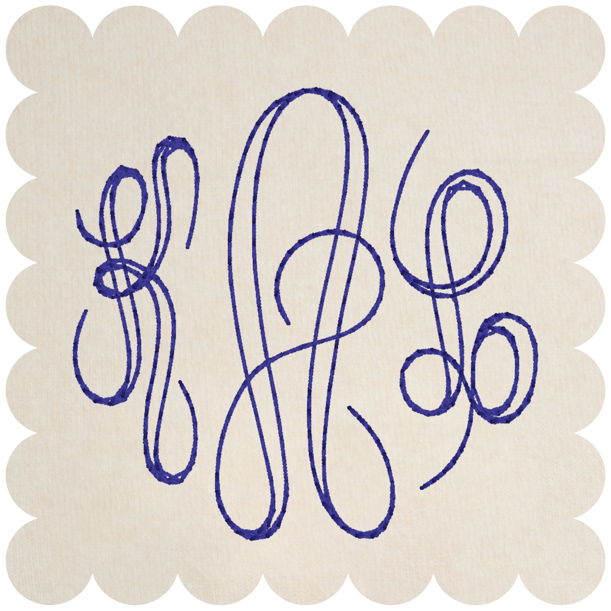 This monogram, perfect for a personalized baby gift, allows you to specify the three letters and select up to two thread colors. For a one color monogram, please specify the same color in the first and second choices.